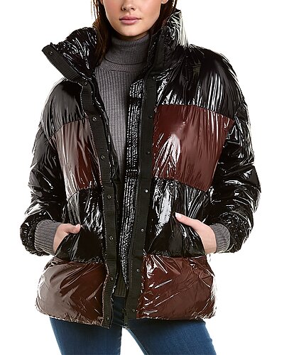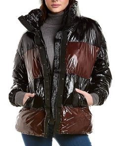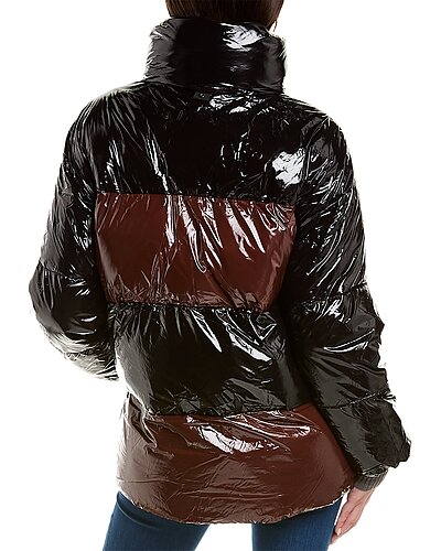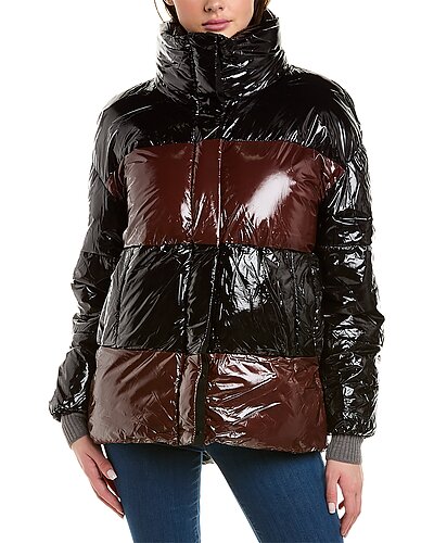- Roberta Coat in cognac/black with glossy design, funnel neck, two front pockets, and drawcord at hem