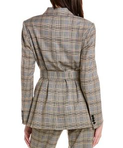 - Linen-Blend Jacket in tan stripe with sharp asymmetrical hemline