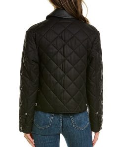 - Diamond Quilted Jacket in midnight blue with diamond quilted design, spread collar and buckle strap, dual front pockets, and button straps at cuffs