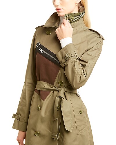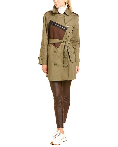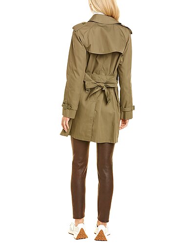 - Double-Breasted Trench Coat in olive with epaulette details, buckle straps, zippered canvas pouch pockets, two front pockets, belted waist, and center back vent at hem