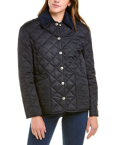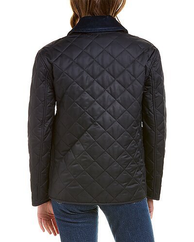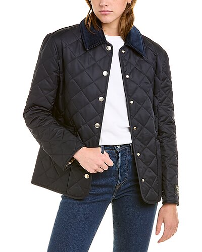 - Quilted Jacket in midnight blue with quilted design, corduroy trim collar, gold-toned snaps, and three front pockets