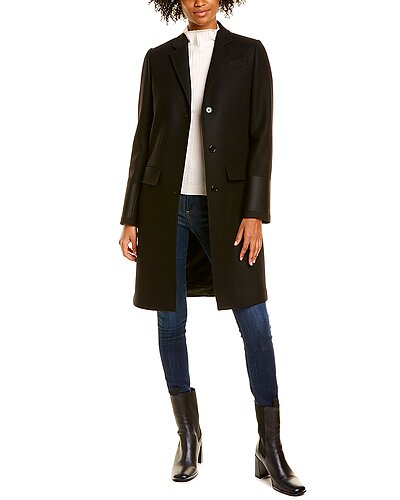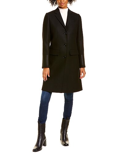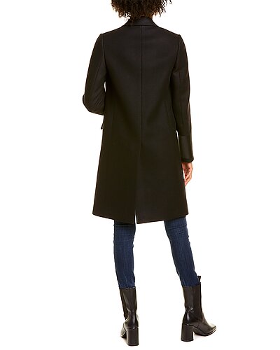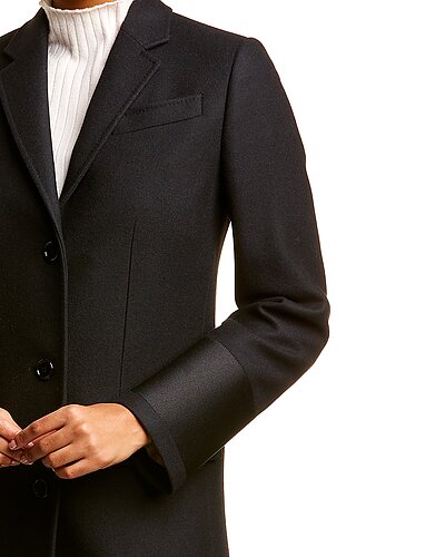 - Tailored Wool & Camel Blend Coat in black with notch lapel, left chest pocket, two front pockets, and center vent at back hem