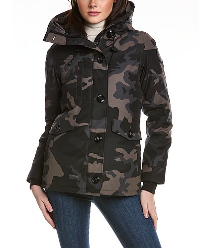 - Rideau Down Parka in black classic camo with funnel neck, hood at back, four front pockets, rib-knit inner cuffs, inner drawcord at waist