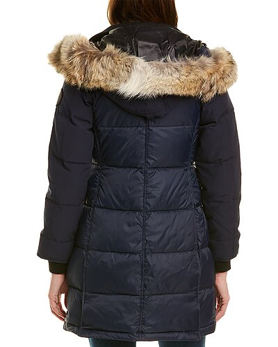 - Rowley Fusion Fit Black Label Parka in admiral blue with quilted design, fur-trimmed hood, two front pockets, ribbed inner cuffs and snap vents at back hem