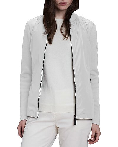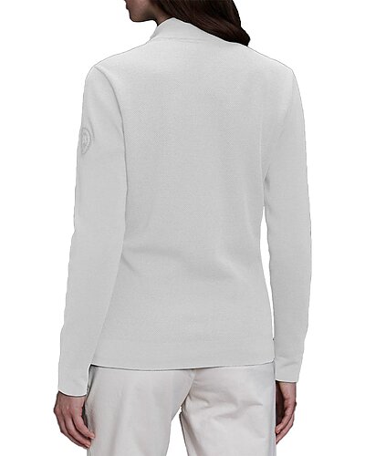 - Windbridge Wool Sweater in white with rib-knit collar and back hem add comfort, black tonal Canada goose arctic disc on left sleeve, 2 exterior pockets: front pockets with zipper closures