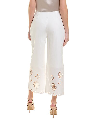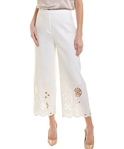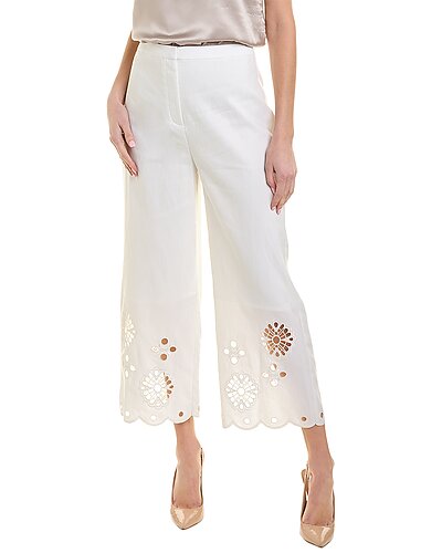 - Embroidered Linen-Blend Pant in white with high rise and scallop hem