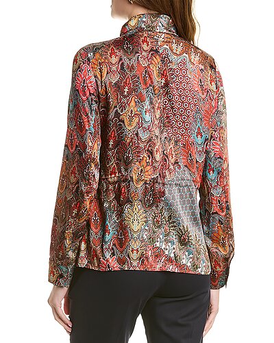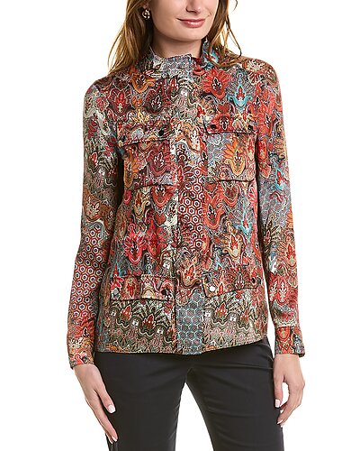- Paisley Cargo Jacket in red multicolor with four-front-pocket styling, mandarin collar, and button cuffs