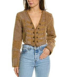 - Juliette Cropped Jacket in yellow multicolor with V-neck and fringe trim