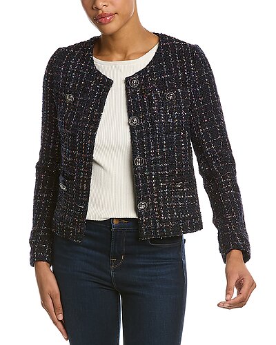 - Jacket in navy with embellished buttons, four pockets, and tweed fabric