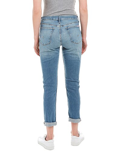- Natalie Slim Boyfriend Crop in honey bee with belt loops, whiskering and fading details, cuffed hem, and classic five-pocket styling