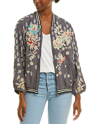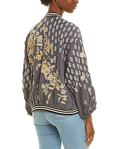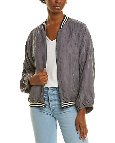 - Nancy Reversible Bomber Jacket in cloud blue with reversible design, embroidered detailing, two front pockets, dropped-shoulder sleeves, elasticized cuffs and ribbed trim