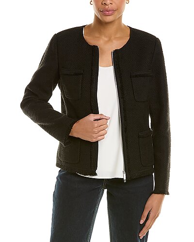 - Benji Linen-Blend Jacket in black with tweed design, dual chest pockets, dual front pockets, fringe trim