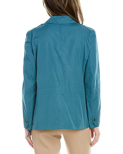 - Petite Rogers Blazer in deep lagoon with notch lapel, button cuffs, elasticized back waist, and dual front pockets