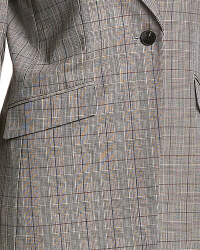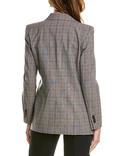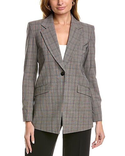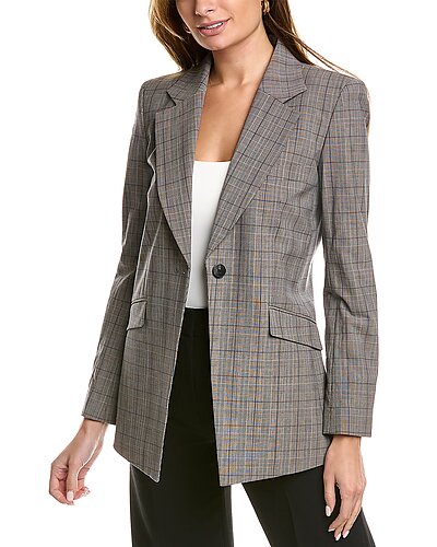 - Virginia Wool-Blend Blazer in black multicolor with notch collar, left chest pocket, dual front pockets, button cuffs, and vented back hem