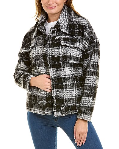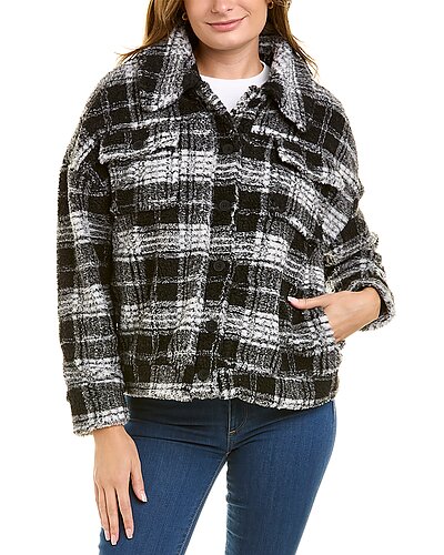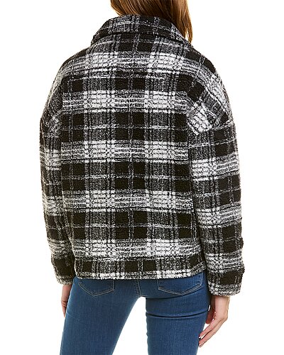 - Teddy Shacket in black plaid with spread collar, dual chest pockets, dropped-shoulder sleeves, and dual side on-seam pockets