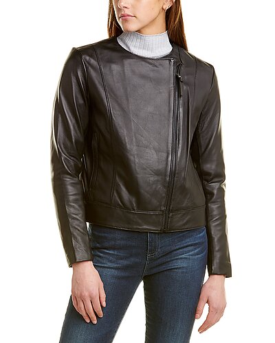 - Cali Leather Jacket in black with two zippered front pockets and rib knit underarms