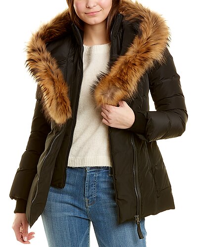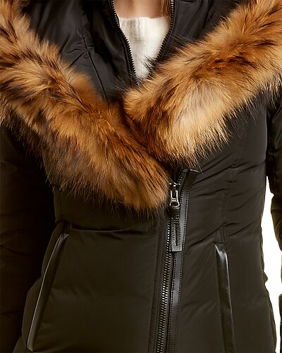 - Design details: shawl hood back with fur trim, inner bib with rib-knit stand-up collar, rib-knit cuffs, two zippered front pockets, leather trim