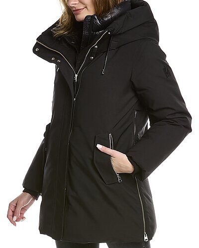 - Kinslee 2-In-1 Oversized Leather-Trim Down Parka in black with hooded funnel neck, removable inner bib with stand-up collar, four front pockets, inner rib cuffs, storm panel at back yoke, and zippered side slits at hem