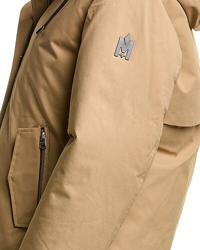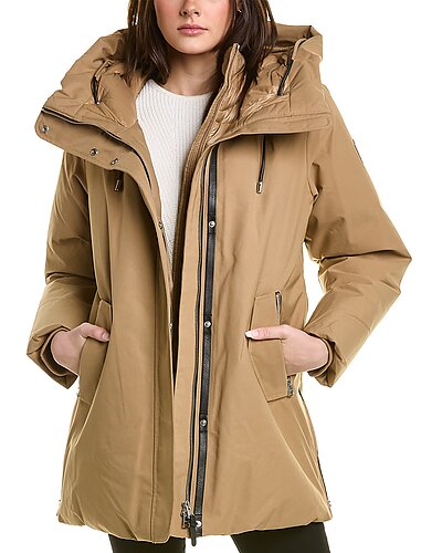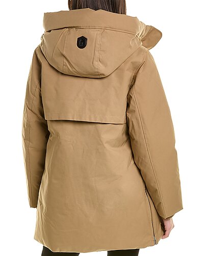 - Kinslee Oversized Down Parka in camel with stand-up collar, drawstring hood, four front pockets, ribbed inner cuffs, removable quilted vest, and inner drawcord waistband