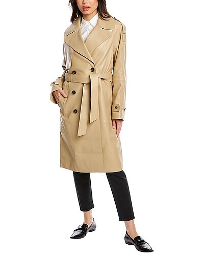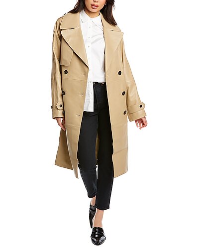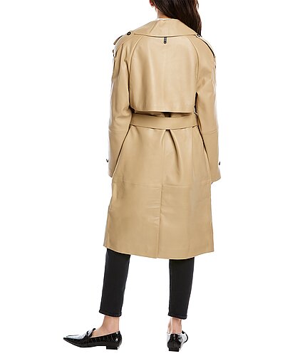 - Trisha Leather Trench Coat in beige with notched lapel, storm flap accents, strap detail at shoulders and cuffs, two front pockets, belted waist and center vent at back hem