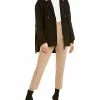 - Renata Coat in black with faux leather design, two front pockets, and faux fur lining