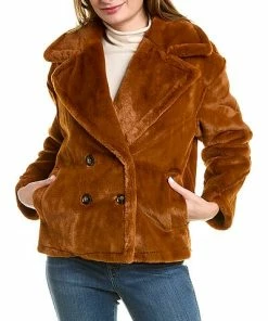 - Rollande Coat in cognac with faux fur design, two front pockets, and dropped-shoulder sleeves