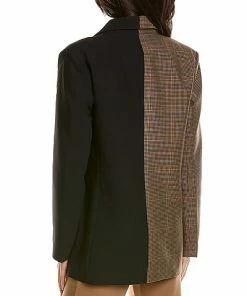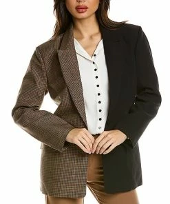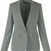 - Design details: peak lapel, dual front pockets, and vented back hem