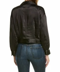 - Cropped Satin Jacket in black with dual front pockets, point collar, and button cuffs