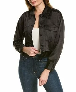 - Cropped Satin Jacket in black with dual front pockets, point collar, and button cuffs