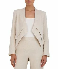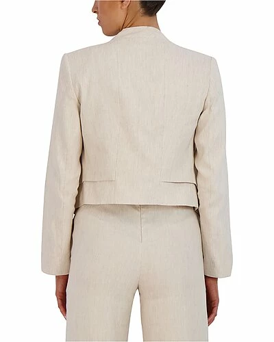 - Linen-Blend Jacket in tan stripe with sharp asymmetrical hemline
