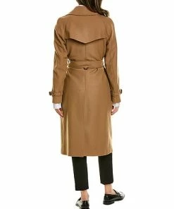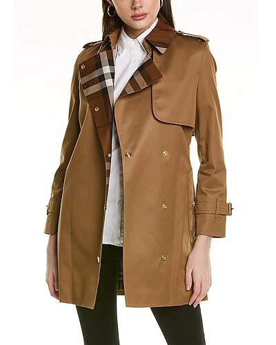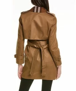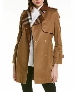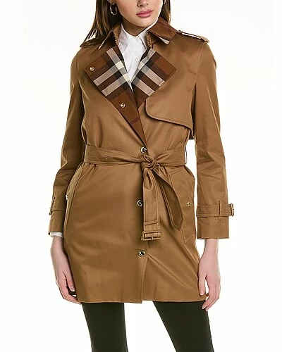 - Check Gabardine Coat in dusty caramel with spread collar, storm flap accents, strap accents at shoulders and cuffs, two front pockets and belted waist