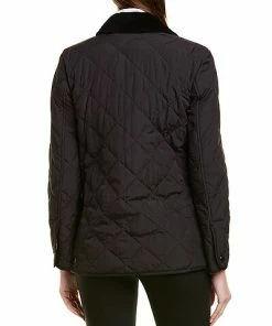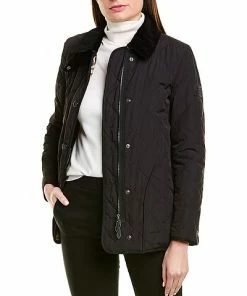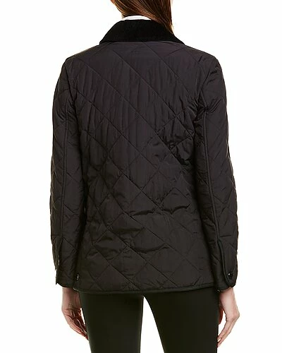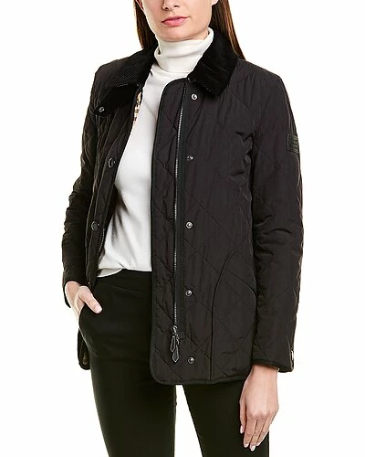 - Diamond Quilted Barn Jacket in black with quilted design, spread collar with corduroy trim, dual front pockets, snap cuffs, inner left pocket