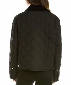 - Diamond Quilted Jacket in midnight blue with diamond quilted design, spread collar and buckle strap, dual front pockets, and button straps at cuffs