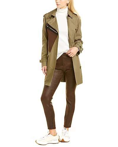 - Double-Breasted Trench Coat in olive with epaulette details, buckle straps, zippered canvas pouch pockets, two front pockets, belted waist, and center back vent at hem