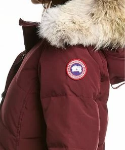 - Lorette Down Parka in elderberry with detachable fur trim at hood, two front pockets, adjustable strap at cuffs, rib-knit inner cuffs, and side vents at back hem