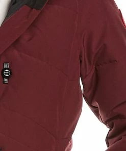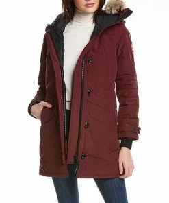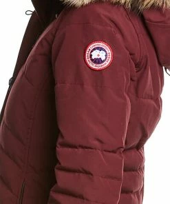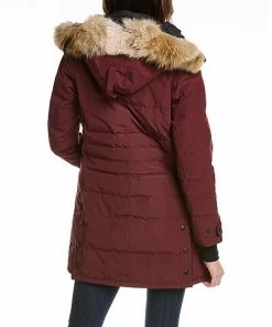 - Lorette Down Parka in elderberry with detachable fur trim at hood, two front pockets, adjustable strap at cuffs, rib-knit inner cuffs, and side vents at back hem