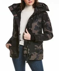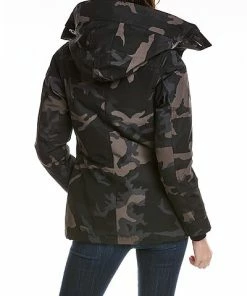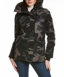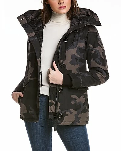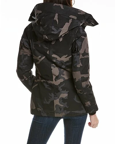 - Rideau Down Parka in black classic camo with funnel neck, hood at back, four front pockets, rib-knit inner cuffs, inner drawcord at waist