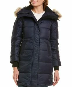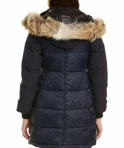 - Rowley Fusion Fit Black Label Parka in admiral blue with quilted design, fur-trimmed hood, two front pockets, ribbed inner cuffs and snap vents at back hem