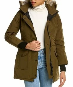- Trillium Hood Down Parka in military green with removable hood with fur trim, four front pockets and ribbed inner cuffs