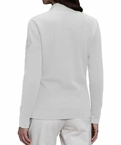 - Windbridge Wool Sweater in white with rib-knit collar and back hem add comfort, black tonal Canada goose arctic disc on left sleeve, 2 exterior pockets: front pockets with zipper closures