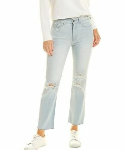 - Farrow High-Rise Ankle in baby blue with belt loops, whiskering and fading details, distressed detailing, raw edge hem, and classic five-pocket styling