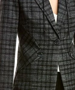 - Plaid Blazer in black multicolor with drawstring hood, peak lapel, and triangle waist panels