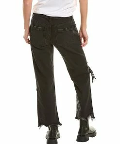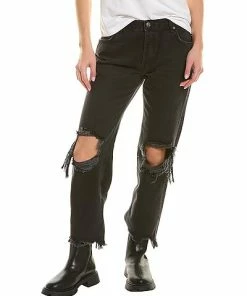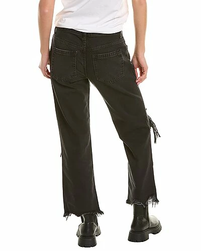 - Maggie Mid Rise Straight Jean in washed black with belt loops, classic five-pocket styling, destroyed knees, and frayed hem