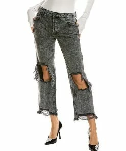 - Maggie Mid Rise Straight Jean in grey with belt loops, classic five-pocket styling, destroyed knees, and frayed hem