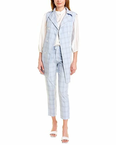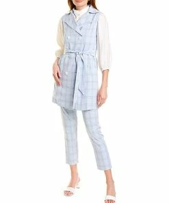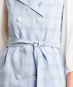 - Double-Breasted Jacket in blue plaid with storm panel at back yoke, two front pockets, tie sash at waist, and center vent at back hem