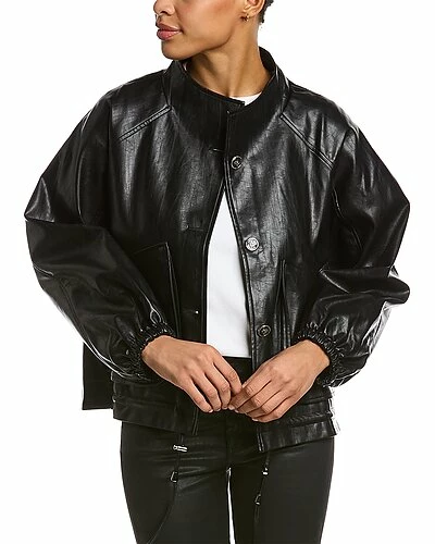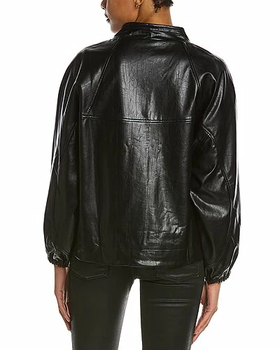 - Jacket in black with faux leather design, funnel neck, elasticized cuffs, two front pockets, and drawstring hem
