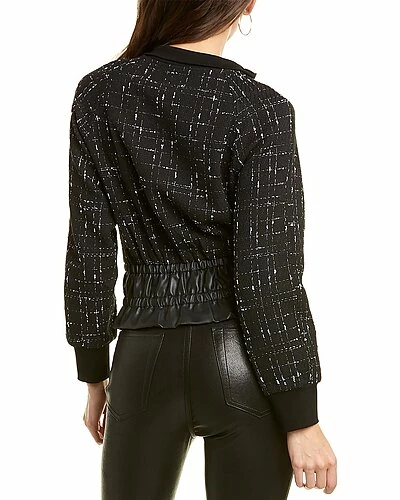 - Tweed Jacket in black with mock neck, ribbed trim, two front pockets, and smocked faux leather trim