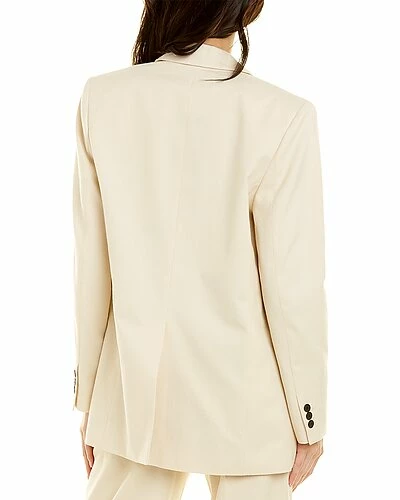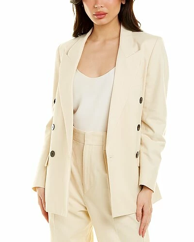 - Design details: pilled fabric, peak lapel, left chest pocket, two front flap pockets, button accents at cuffs and center vent at back hem
