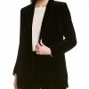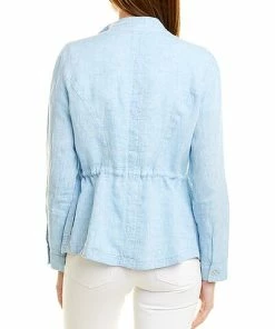 - Vista Linen Jacket in seaside with spread collar, dual chest pockets, inner drawstring waist, and button cuffs