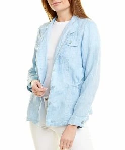 - Vista Linen Jacket in seaside with spread collar, dual chest pockets, inner drawstring waist, and button cuffs